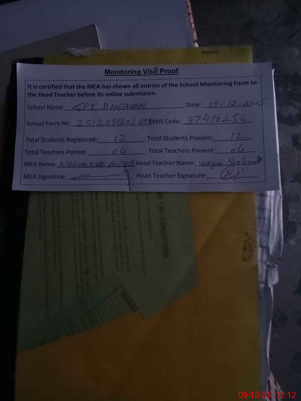 | EMIS Code: 37410256 | Name of School: GPS DHUMAN | |||