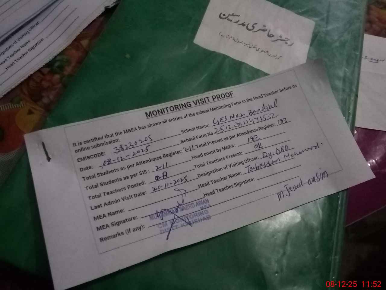 | Remarks (Use Separate Page if Required): Students on SIS QTY 211 Last admin visit On 20 November 2025 by Dy DEO | |||||