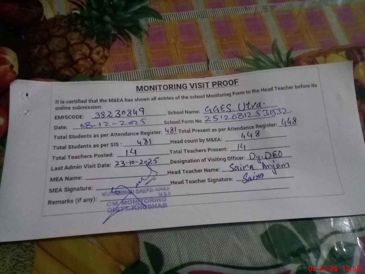 | Remarks (Use Separate Page if Required): Students on SIS QTY 481 Last admin visit On 23 October 2025 by Dy DEO | |||||