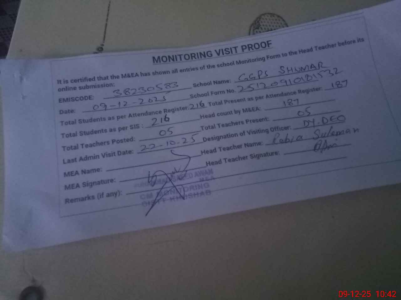 | Remarks (Use Separate Page if Required): Students on SIS QTY 216 Last admin visit On 22 October 2025 by Dy DEO | |||||