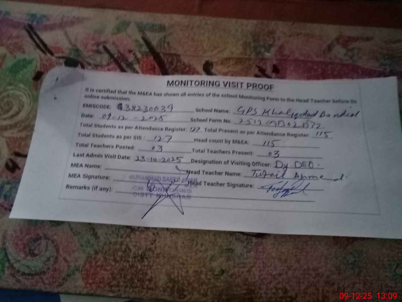 | Remarks (Use Separate Page if Required): Students on SIS QTY 127 Last admin visit On 23 October 2025 by Dy DEO | |||||