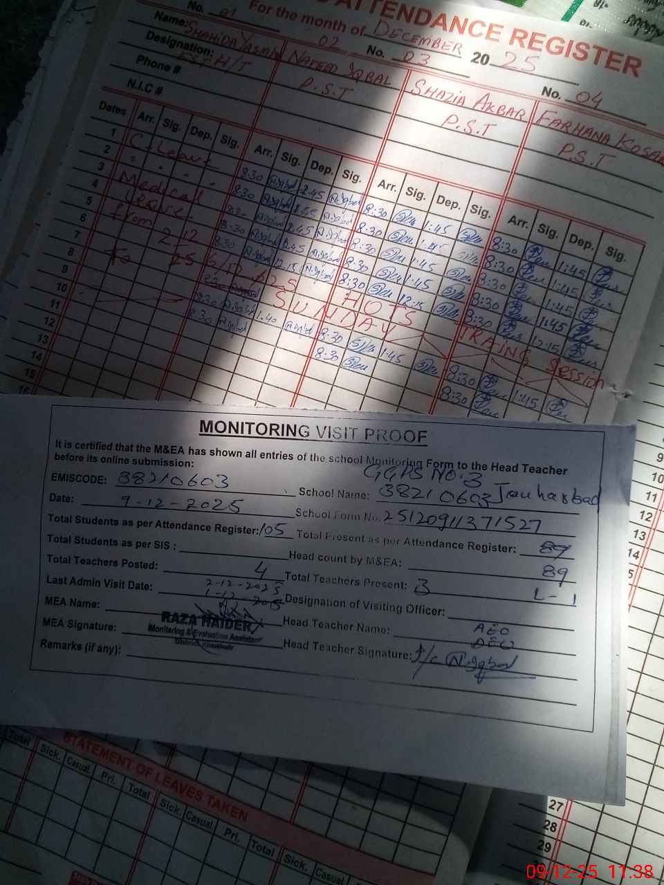 | EMIS Code: 38210603 | Name of School: GGPS NO. 3 JOUHAR ABAD | |||
