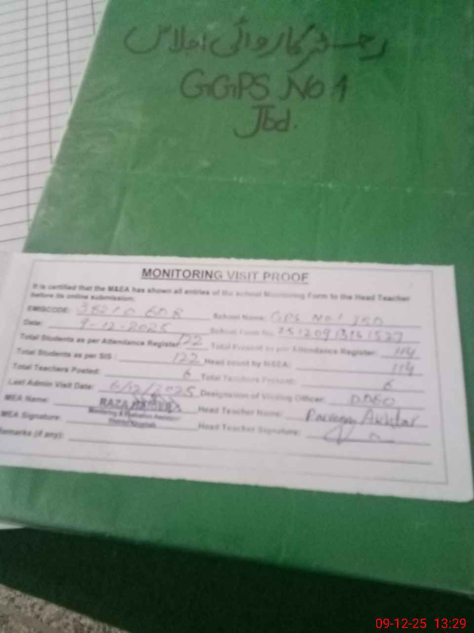 | Attendance Register | Head Teacher | MEA with School | Visit Proof |