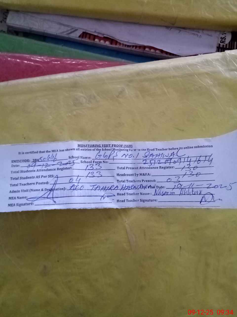 | Attendance Register | Head Teacher | MEA with School | Visit Proof |