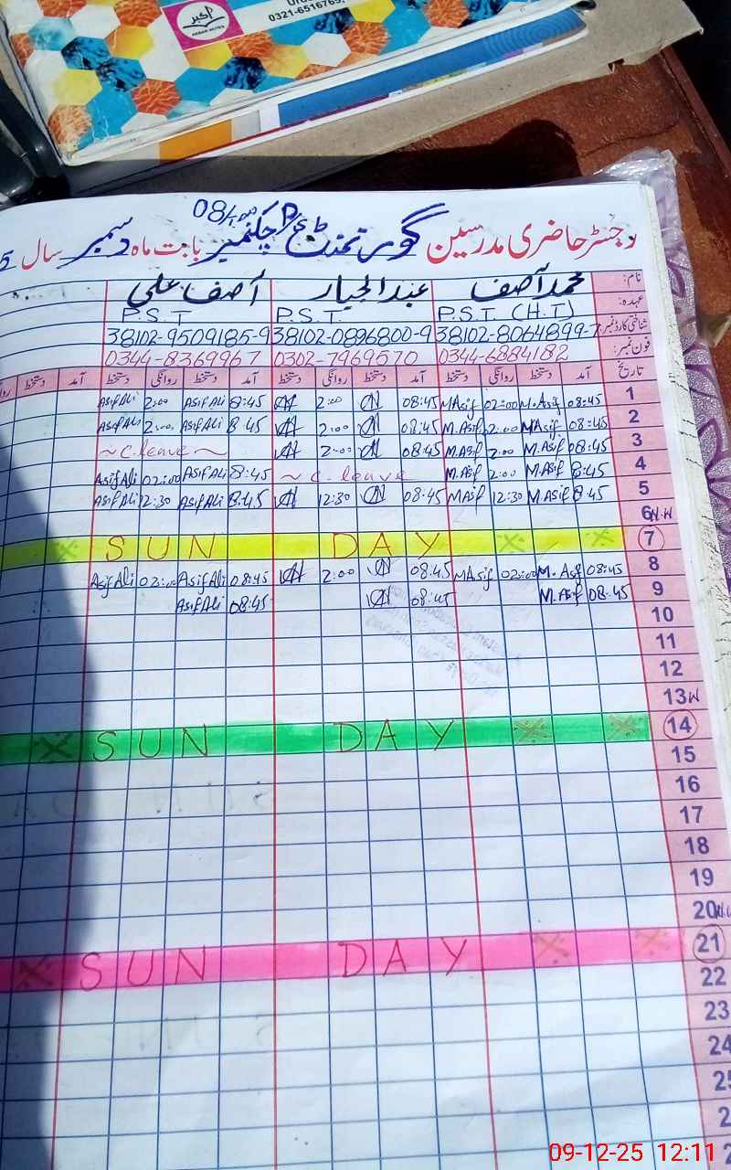 | CNIC | Full Name | Designation | R/C | Absence During Last Calender Month |