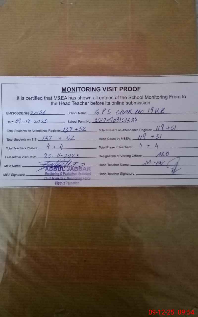 | EMIS Code: 39220156 | Name of School: GPS CHAK NO. 19 KB | |||
