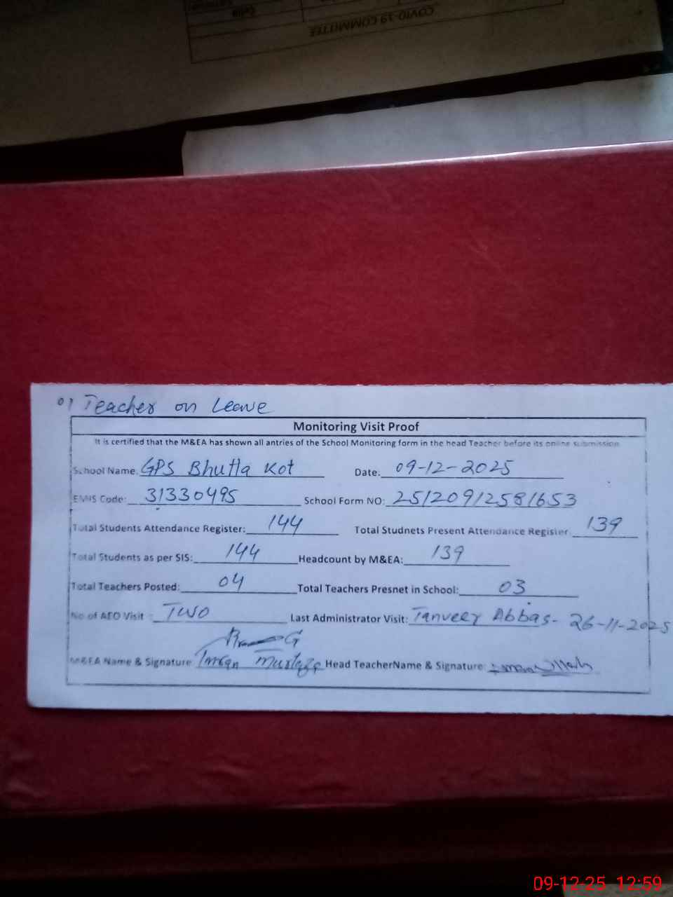 | Attendance Register | Head Teacher | MEA with School | Visit Proof |