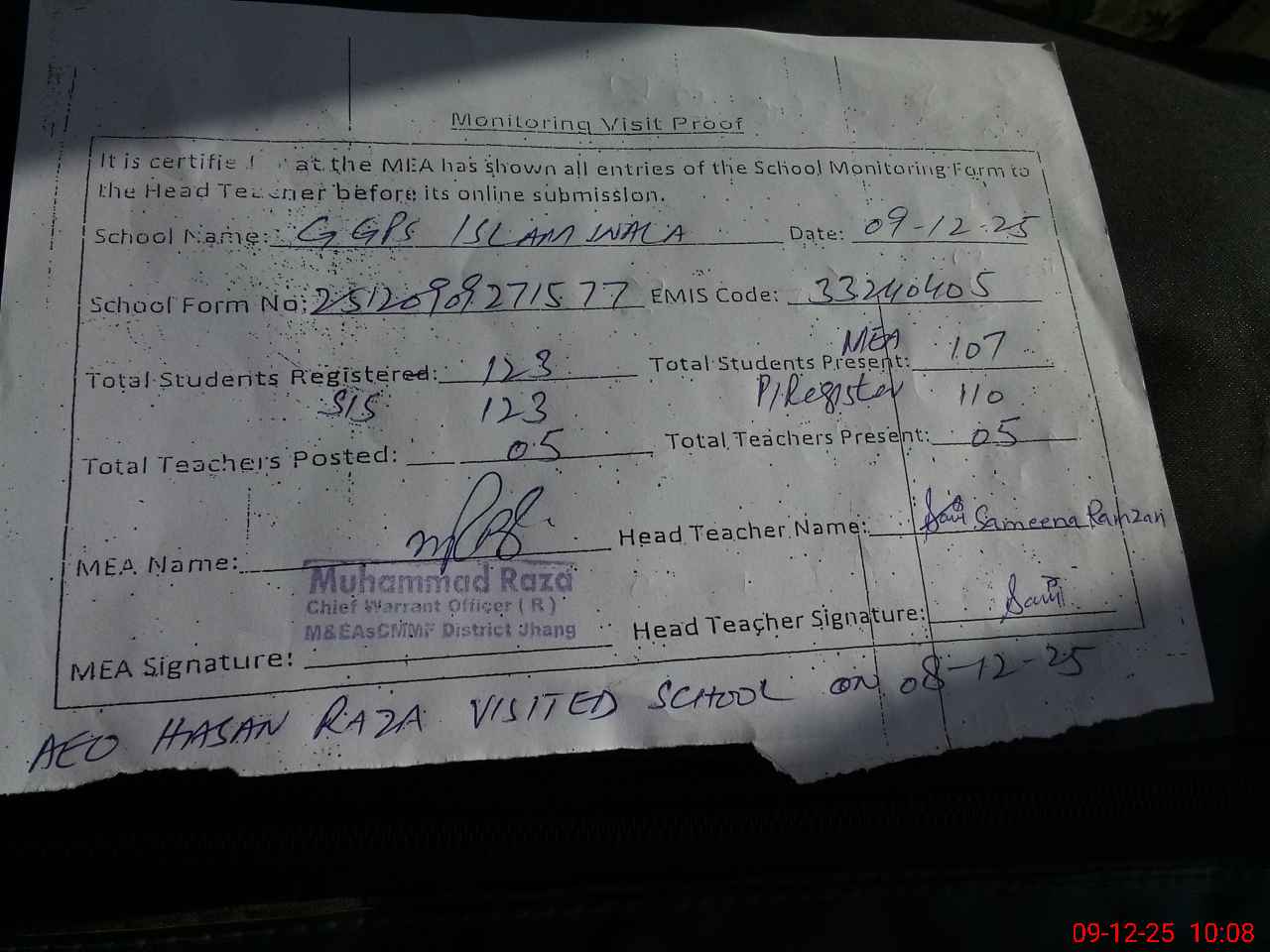 | EMIS Code: 33240405 | Name of School: GGPS ISLAM WALA | |||