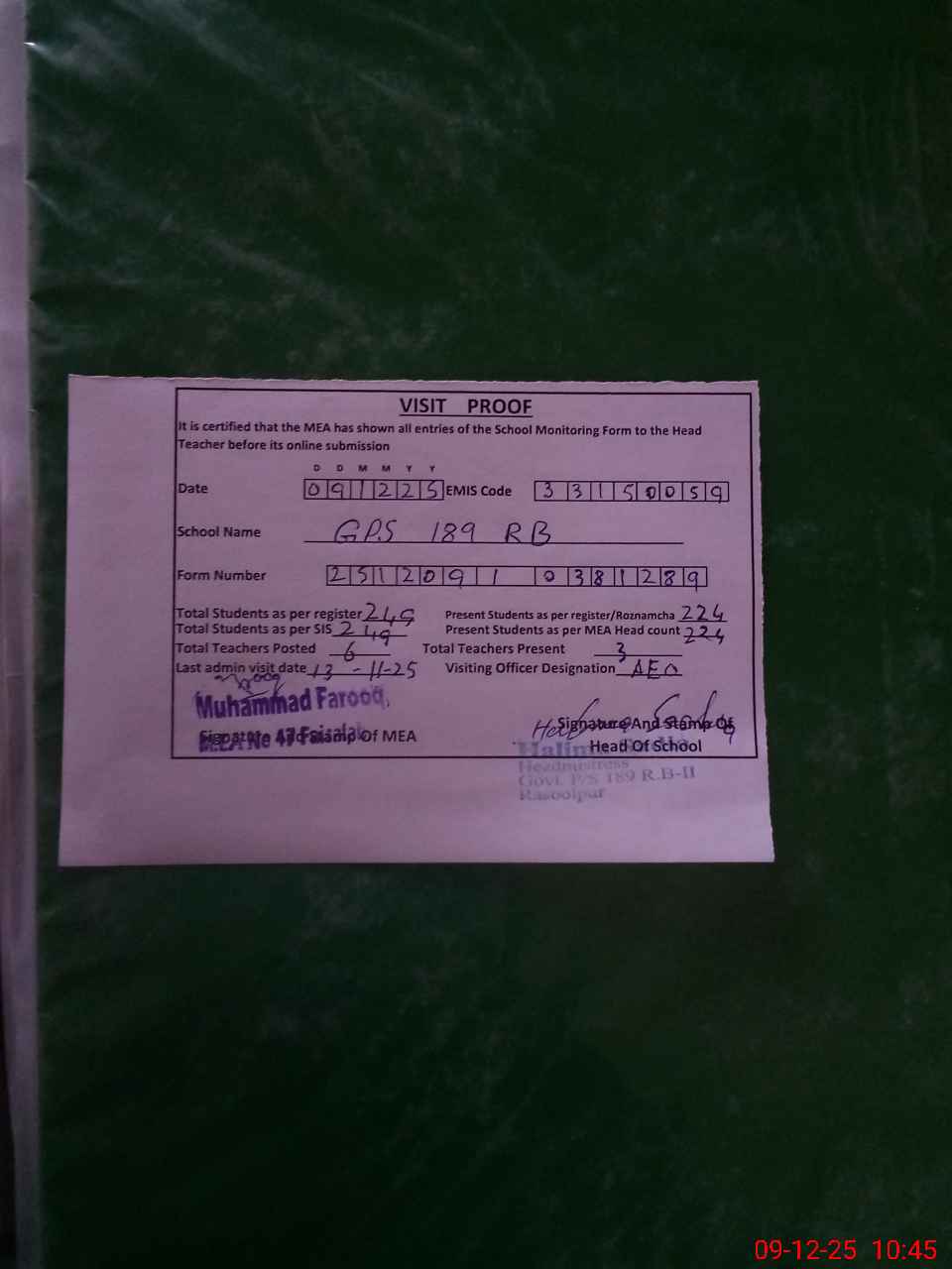 | Attendance Register | Head Teacher | MEA with School | Visit Proof |