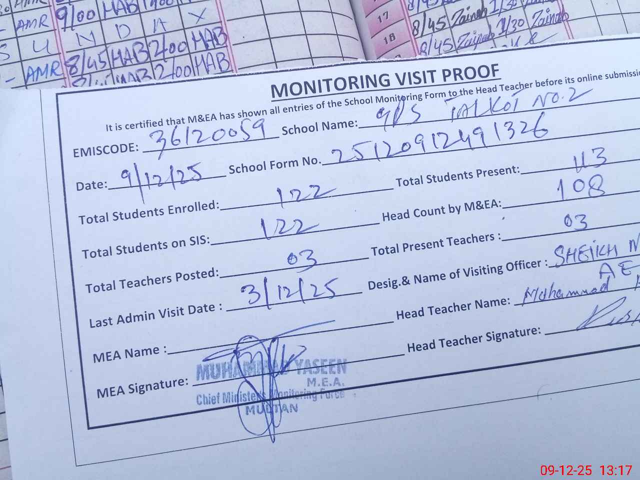 | Attendance Register | Head Teacher | MEA with School | Visit Proof |