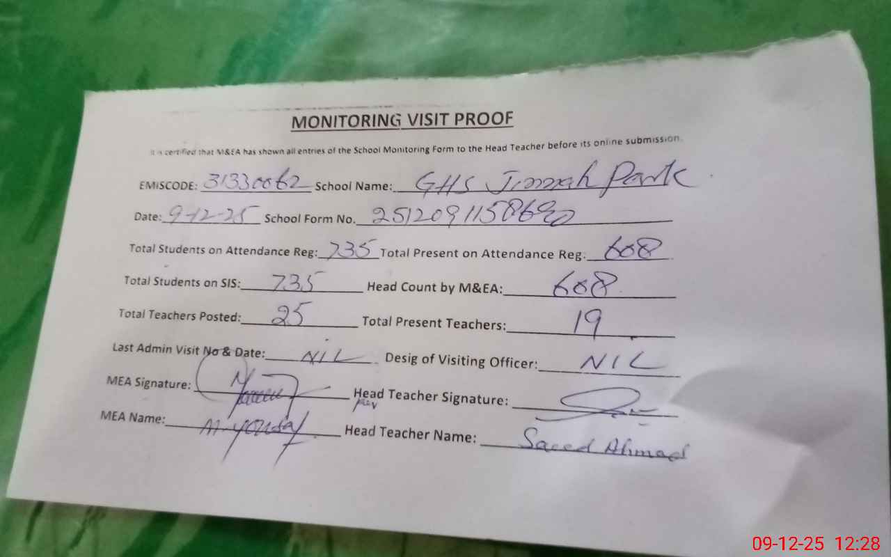 | EMIS Code: 31330062 | Name of School: GHS JINNAH PARK | |||