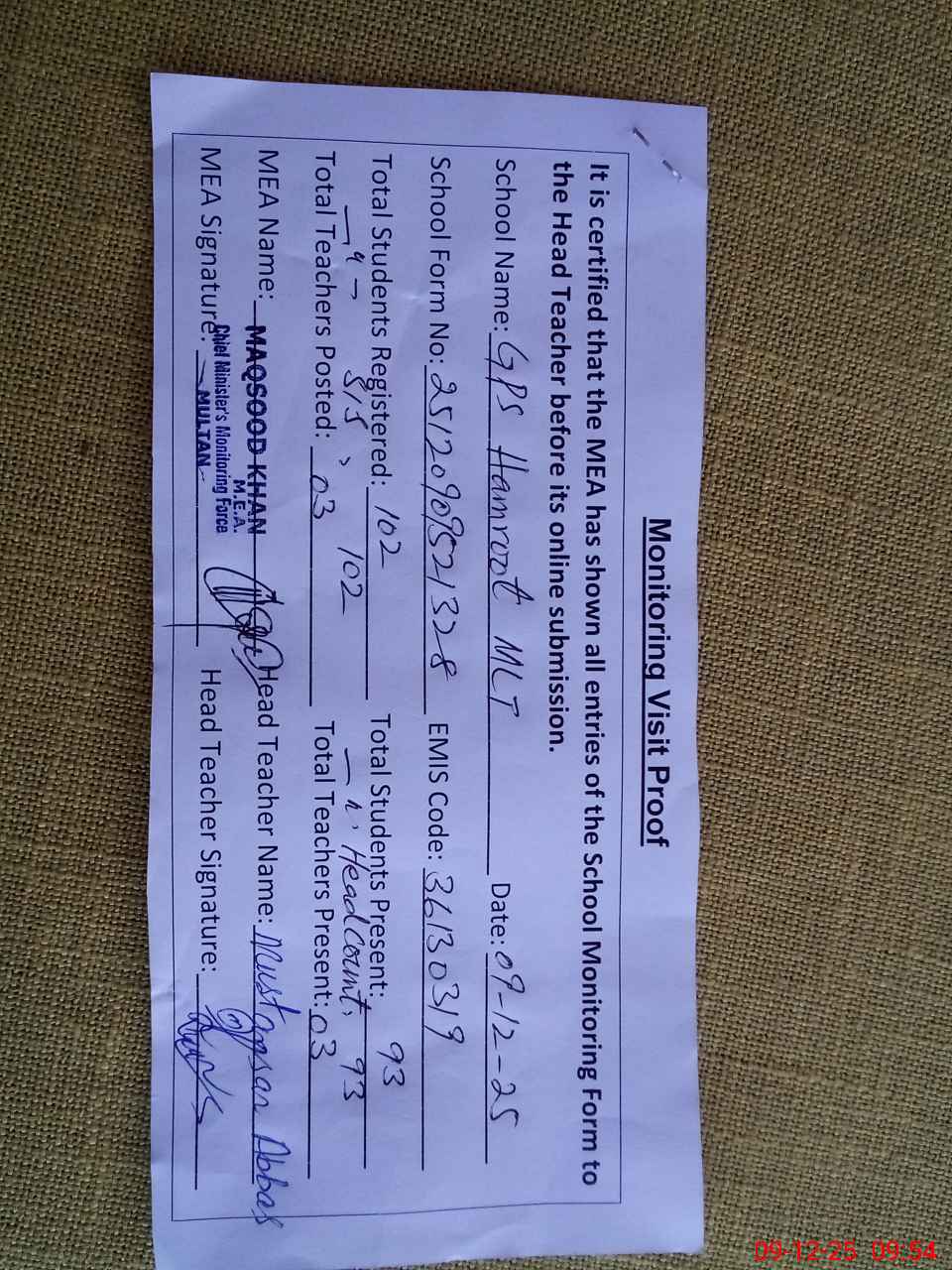 | EMIS Code: 36130319 | Name of School: GPS HAMROOT MULTAN | |||