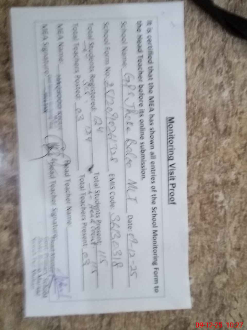 | Attendance Register | Head Teacher | MEA with School | Visit Proof |
