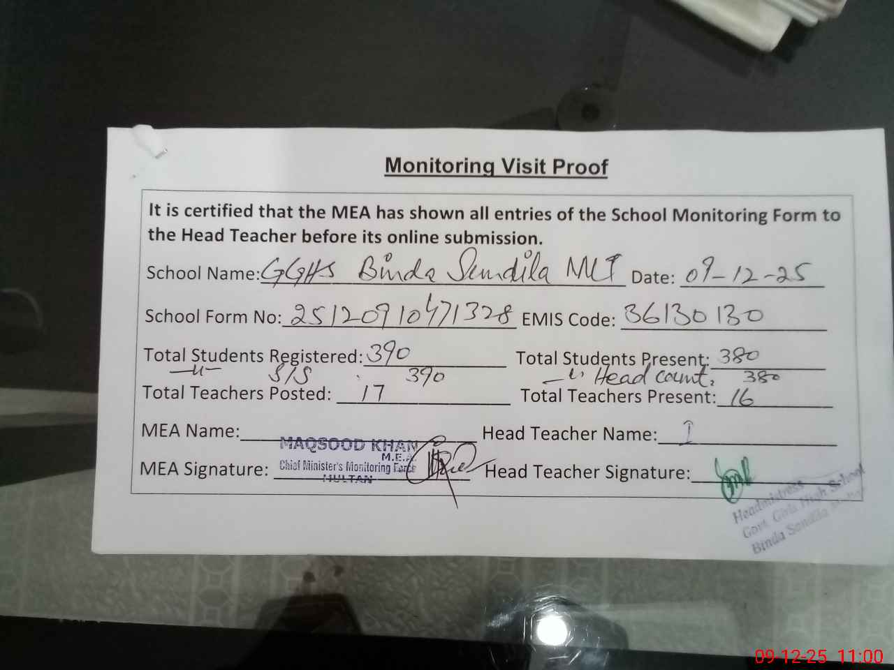 | Monitoring Date: 09-12-2025 | Start Time: 09-12-2025 10:35 AM | End Time: 09-12-2025 11:00 AM | Name of MEA: MA**** ULHA**** KH**** | |