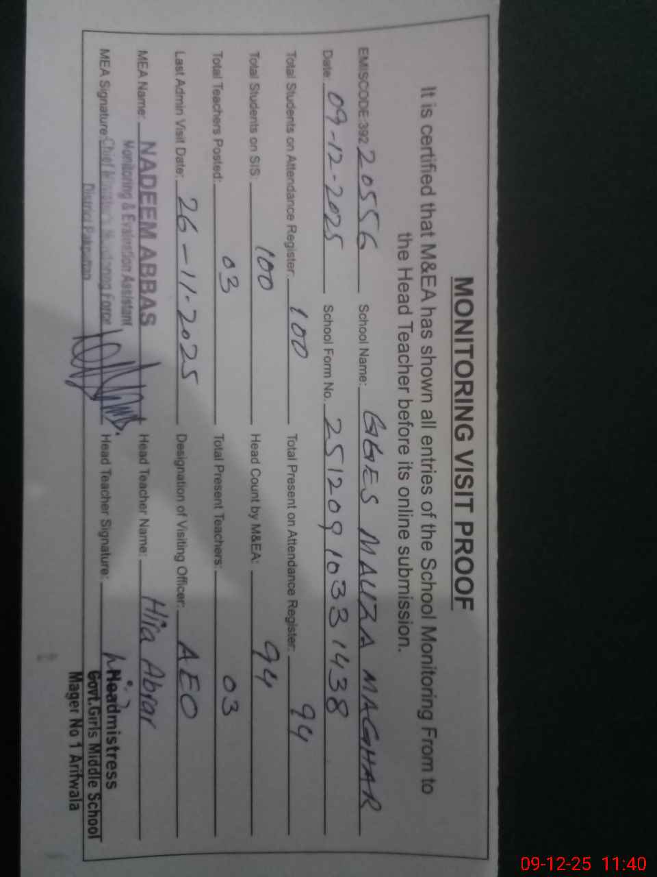 | Certified that this School was Inspected by the Undersigned MEA/DMO Today and the Information Stated Above is as Per Record. | |||||