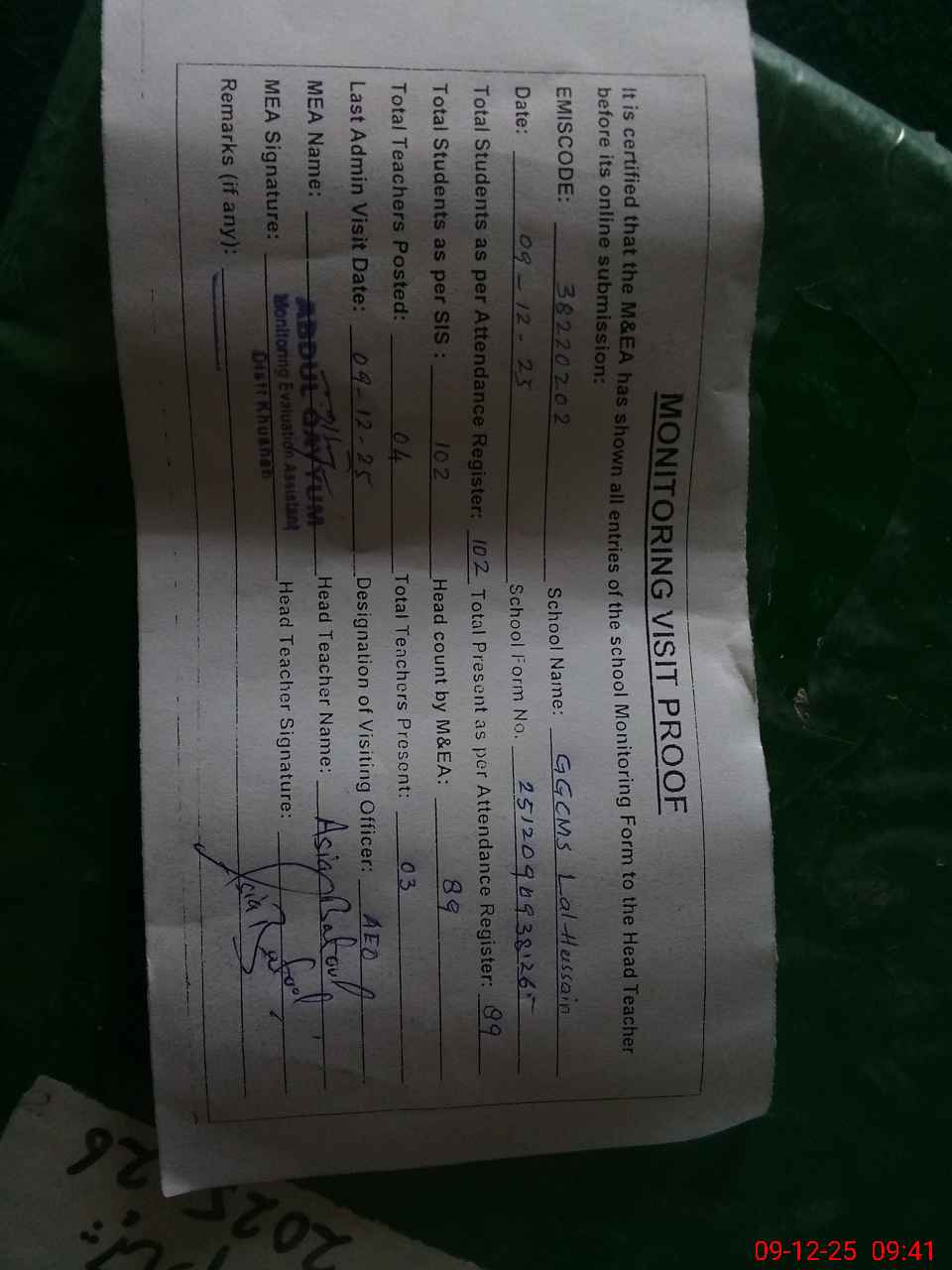 | Attendance Register | Head Teacher | MEA with School | Visit Proof |