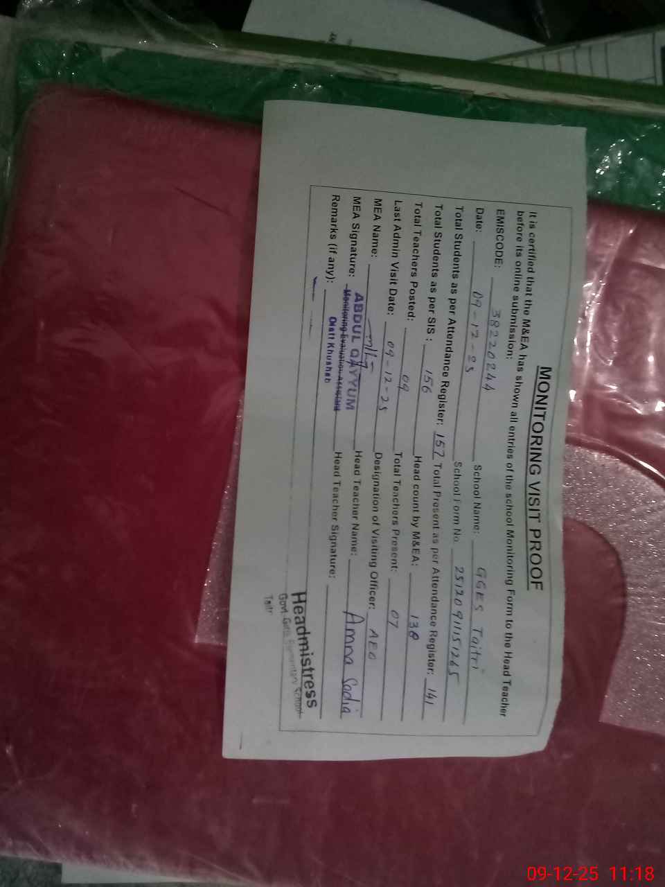 | Attendance Register | Head Teacher | MEA with School | Visit Proof |