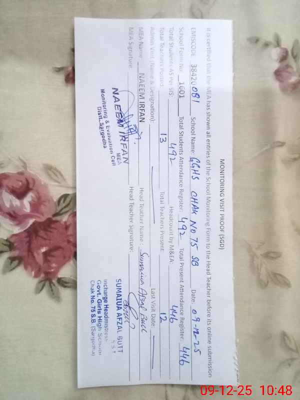 | EMIS Code: 38420081 | Name of School: GGHS CHAK NO.75 SB | |||