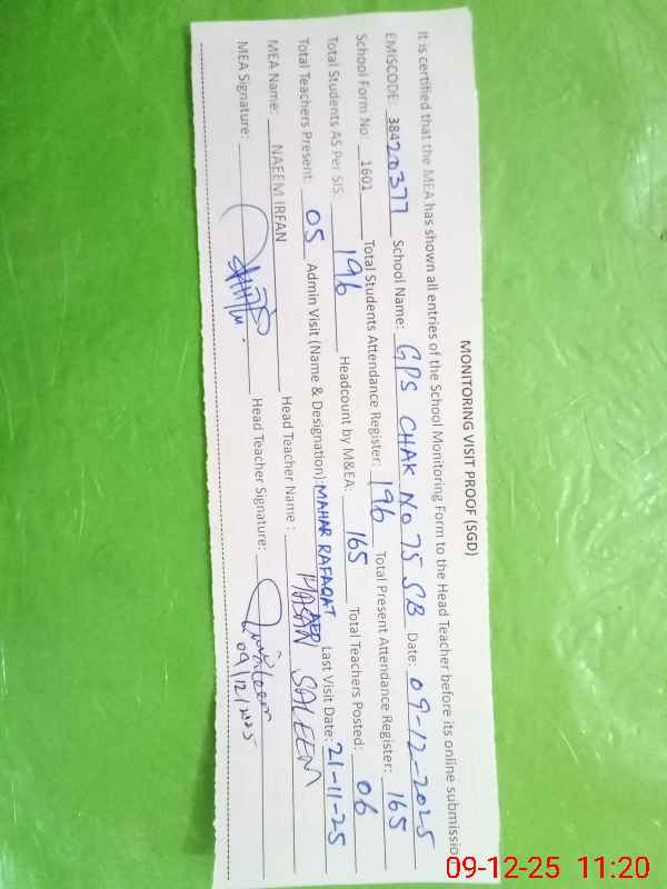 | EMIS Code: 38420377 | Name of School: GPS CHAK NO.75 SB | |||
