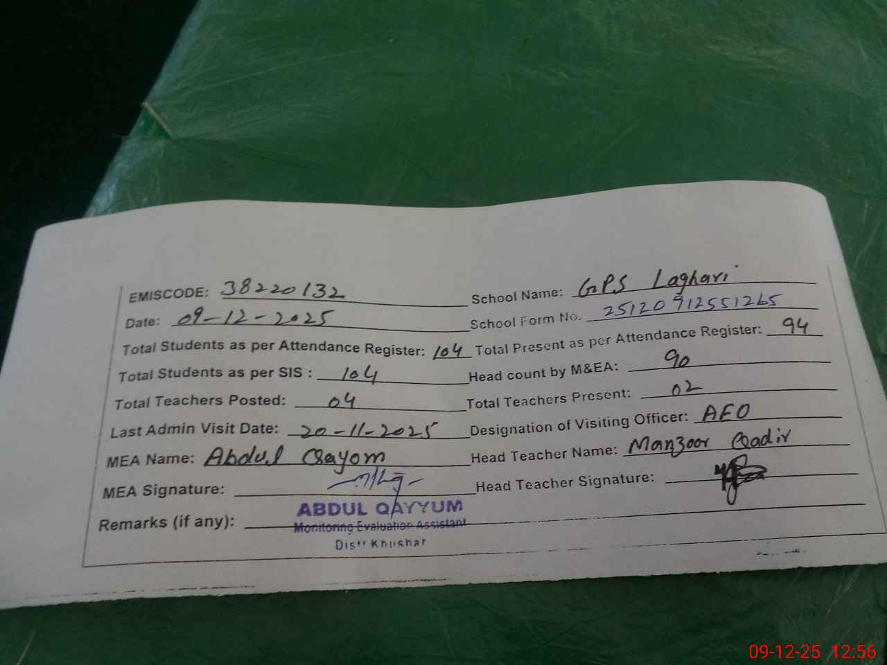 | EMIS Code: 38220132 | Name of School: GPS LAGHARI | |||
