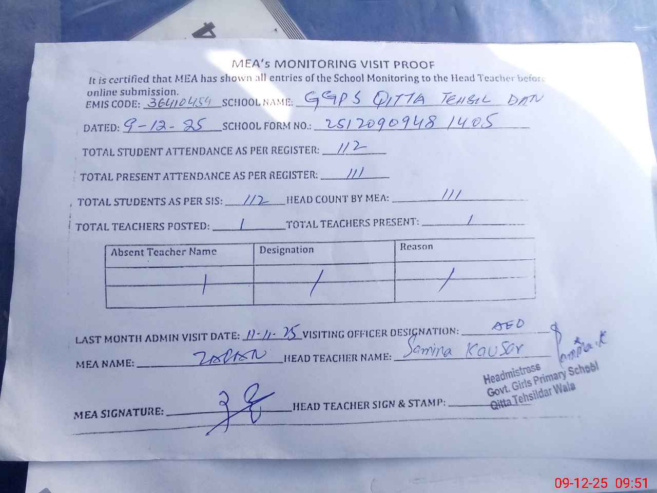 | Attendance Register | Head Teacher | MEA with School | Visit Proof |