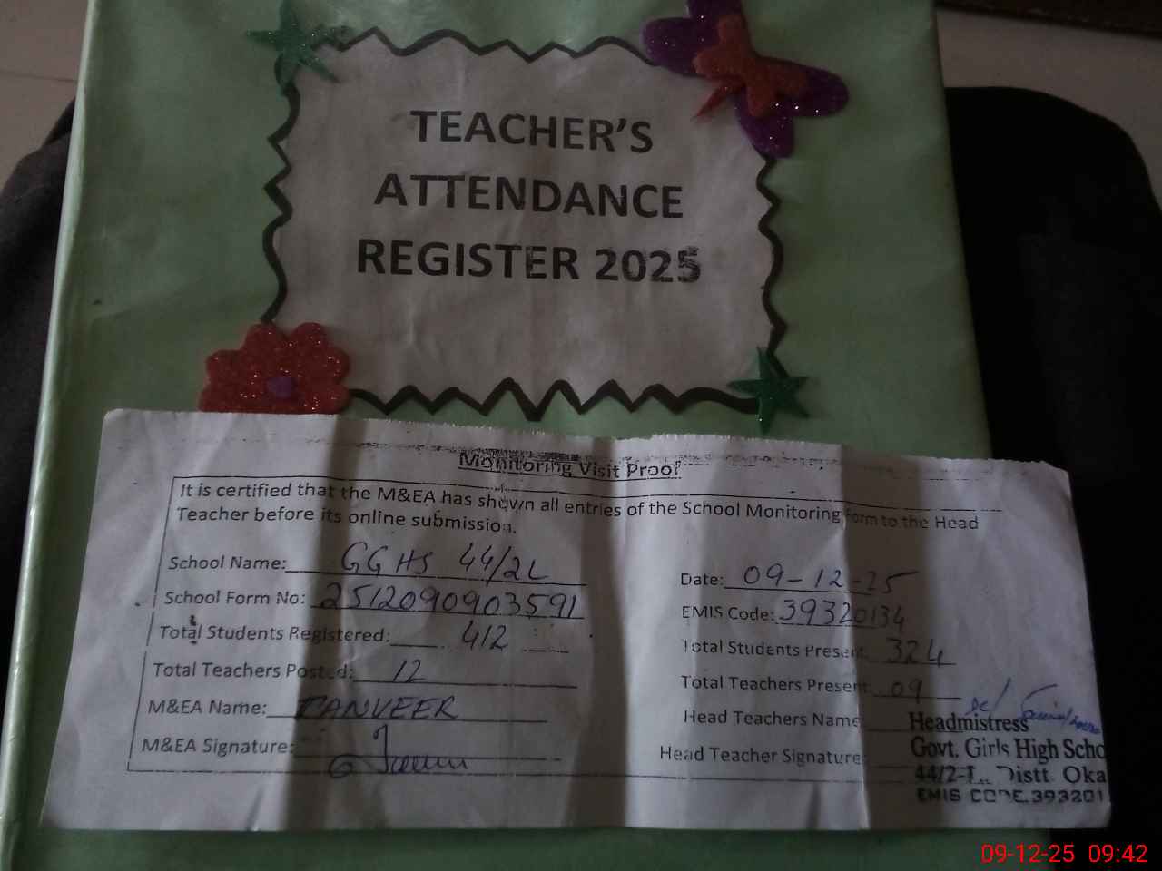 | EMIS Code: 39320134 | Name of School: GGHS CHAK NO.44/2-L | |||