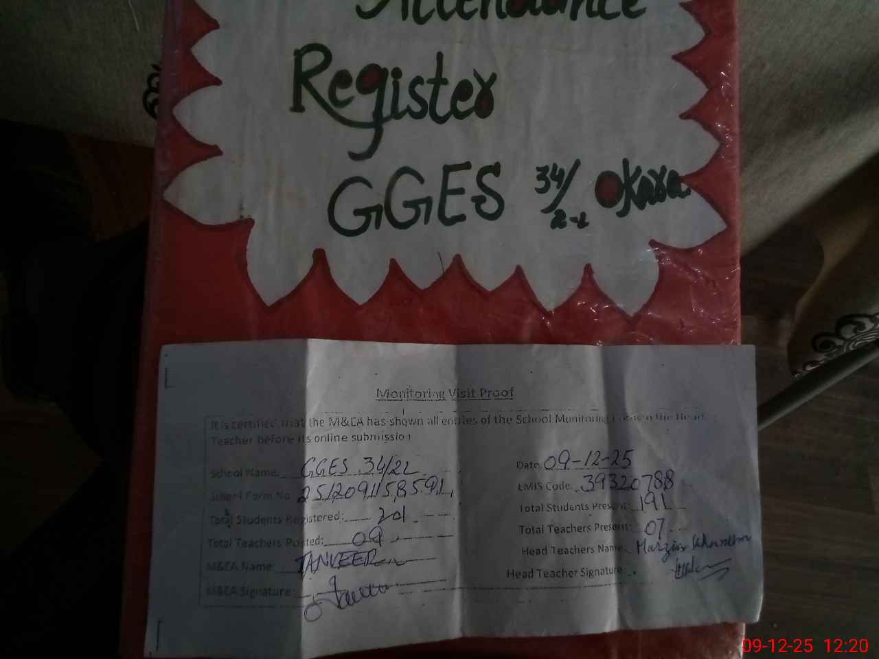 | Attendance Register | Head Teacher | MEA with School | Visit Proof |