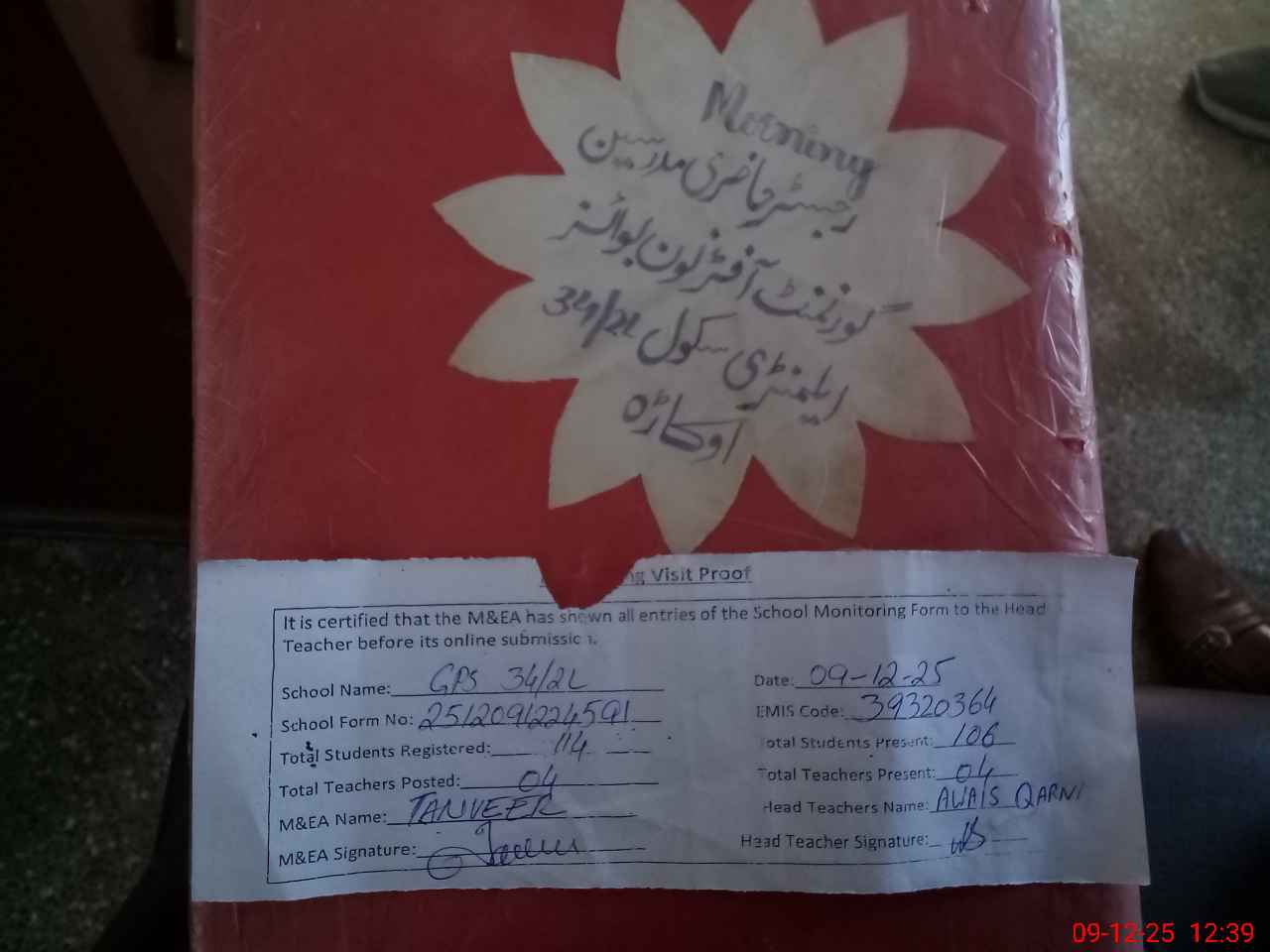 | Attendance Register | Head Teacher | MEA with School | Visit Proof |