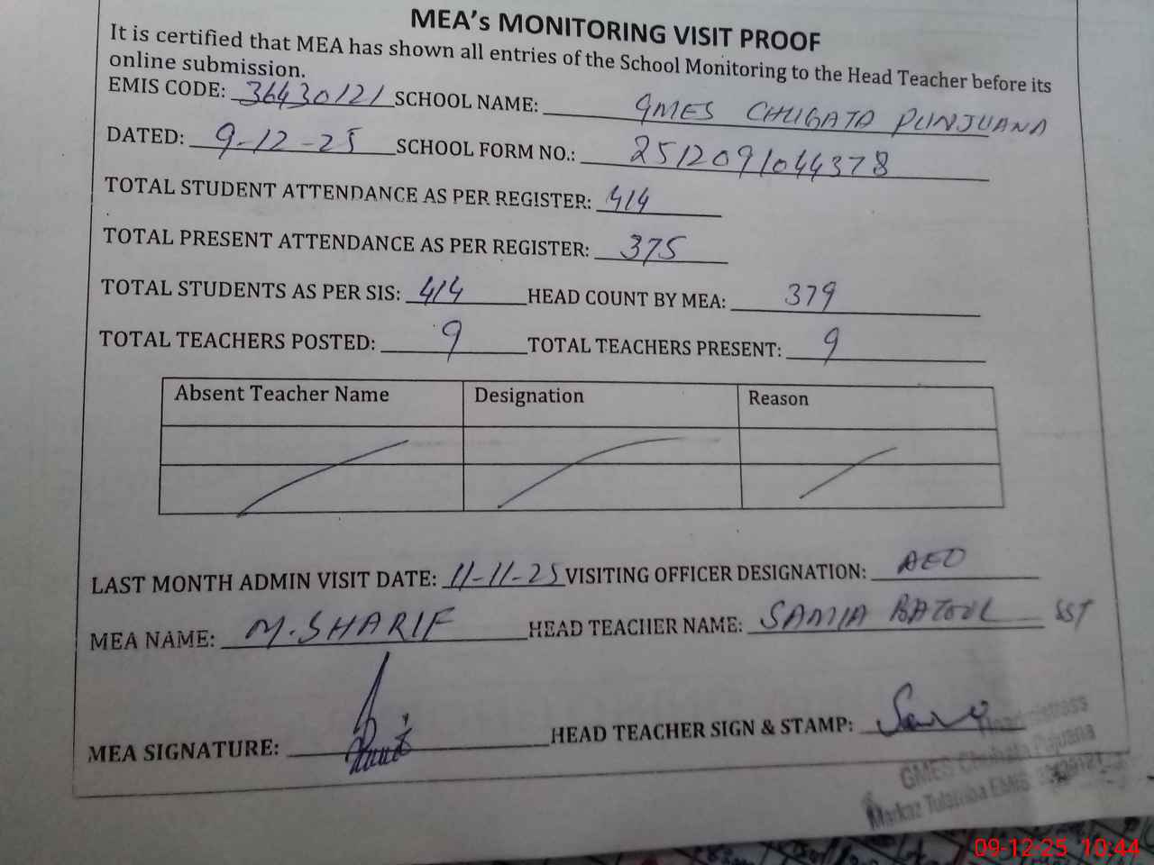 | Attendance Register | Head Teacher | MEA with School | Visit Proof |