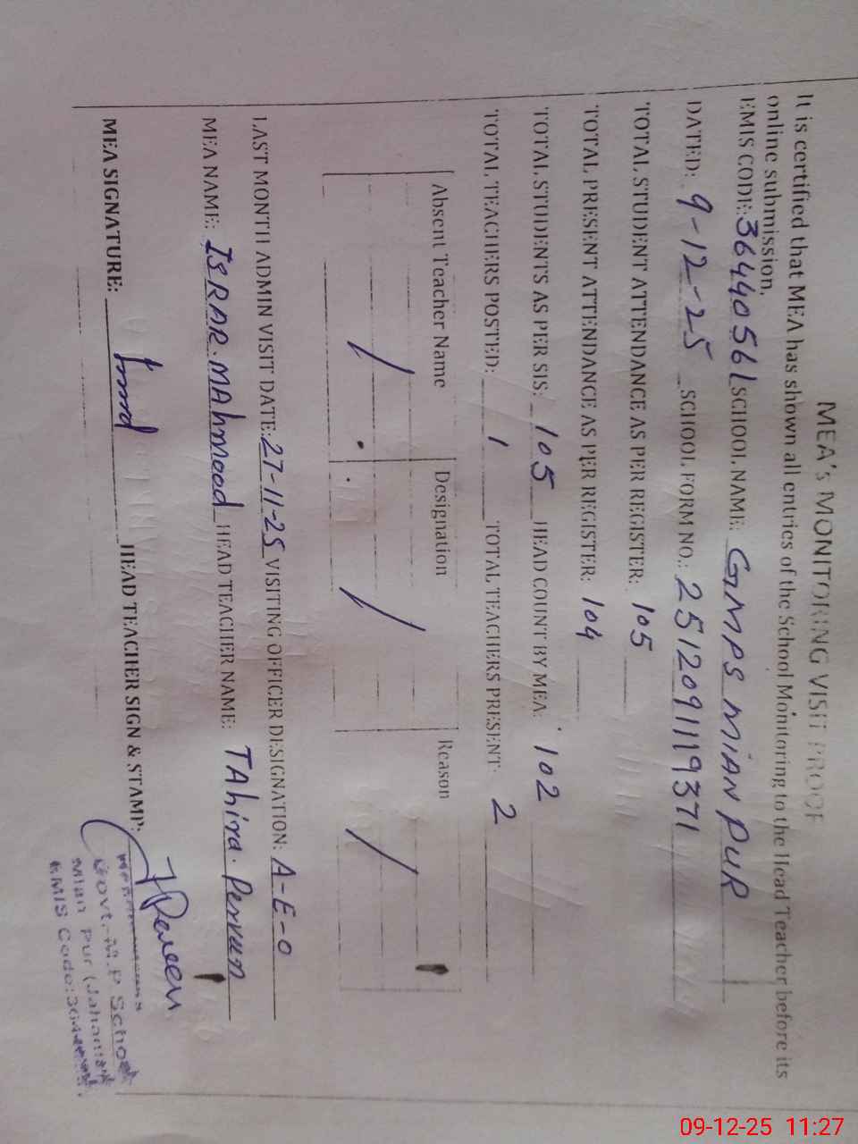 | Attendance Register | Head Teacher | MEA with School | Visit Proof |