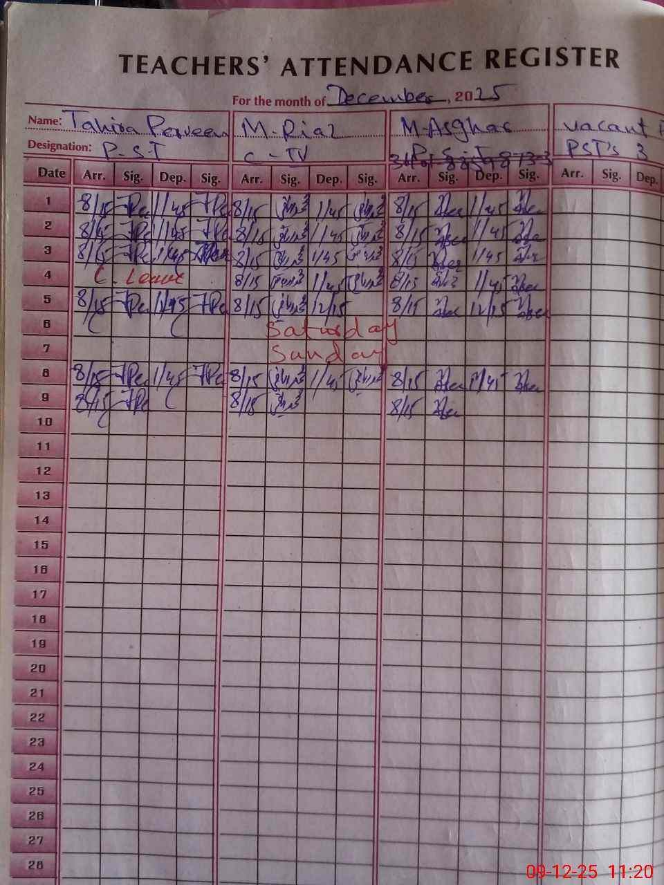 | CNIC | Full Name | Designation | R/C | Absence During Last Calender Month |