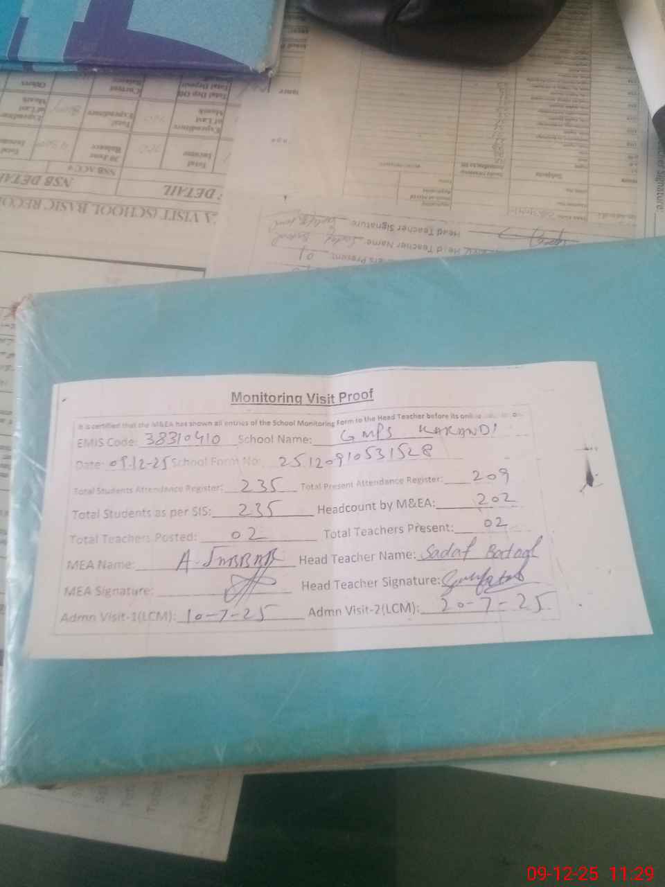 | Attendance Register | Head Teacher | MEA with School | Visit Proof |