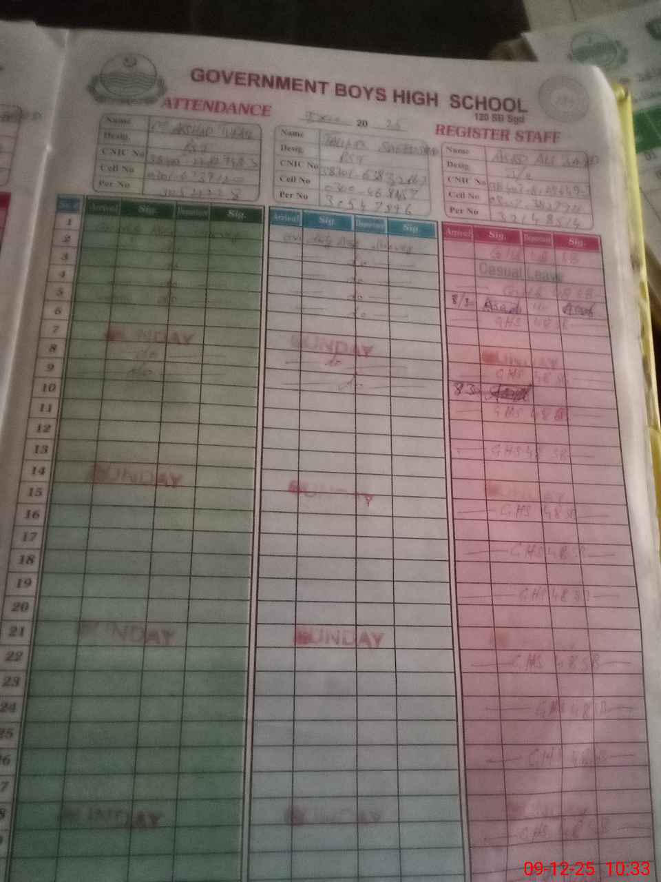 | CNIC | Full Name | Designation | R/C | Absence during last cal. month |