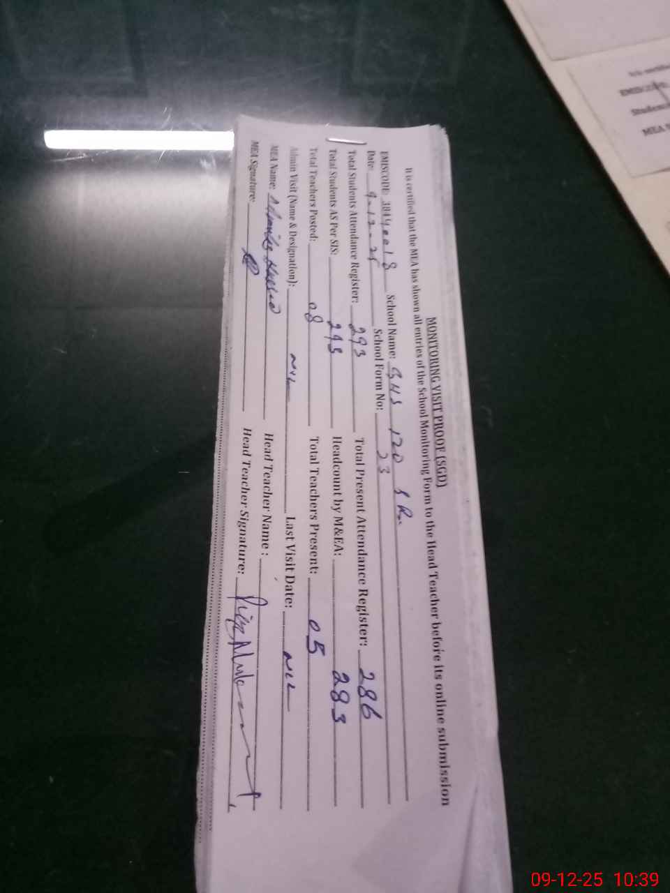 | Attendance Register | Head Teacher | MEA with School | Visit Proof |