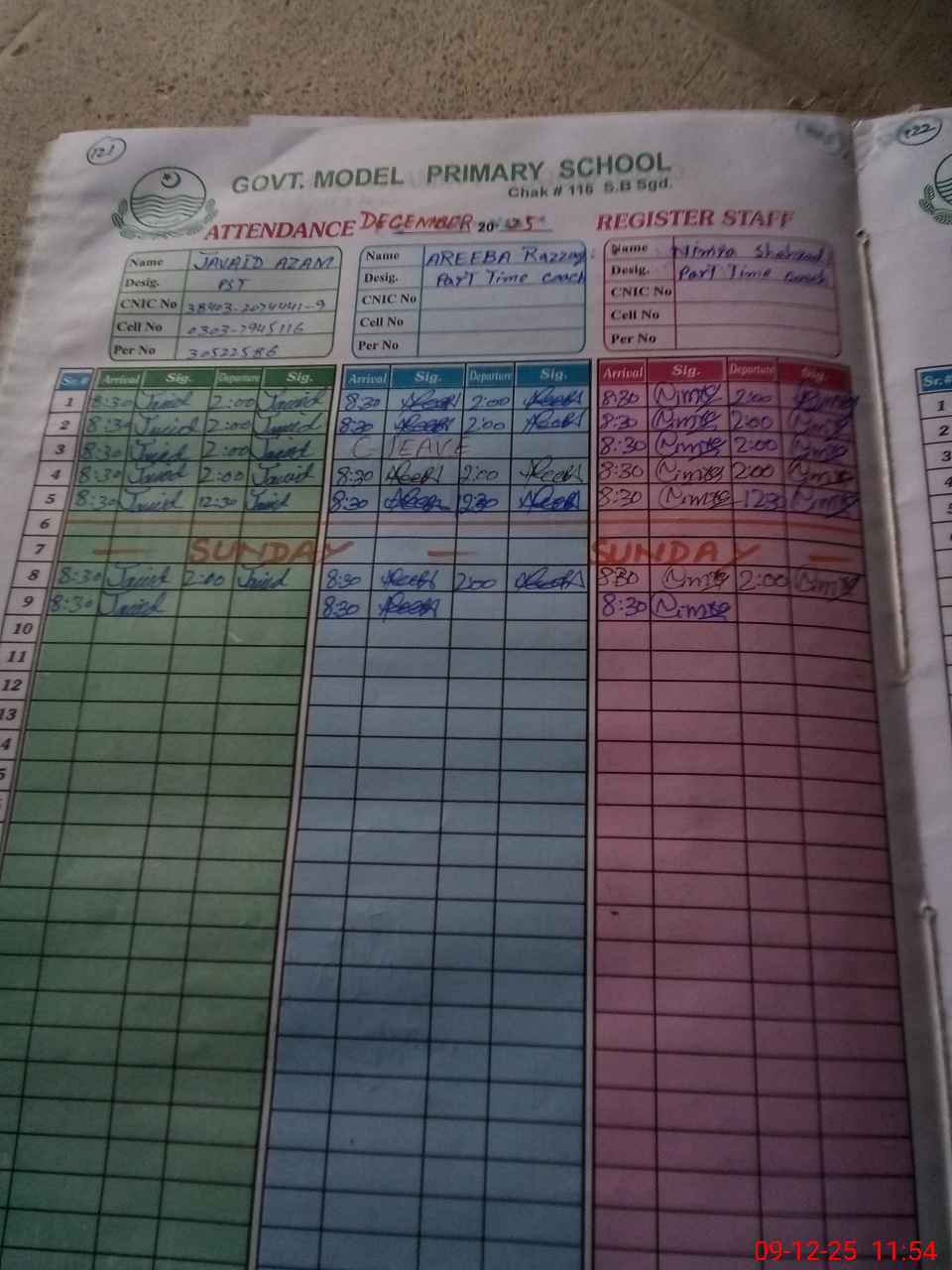 | CNIC | Full Name | Designation | R/C | Absence during last cal. month |