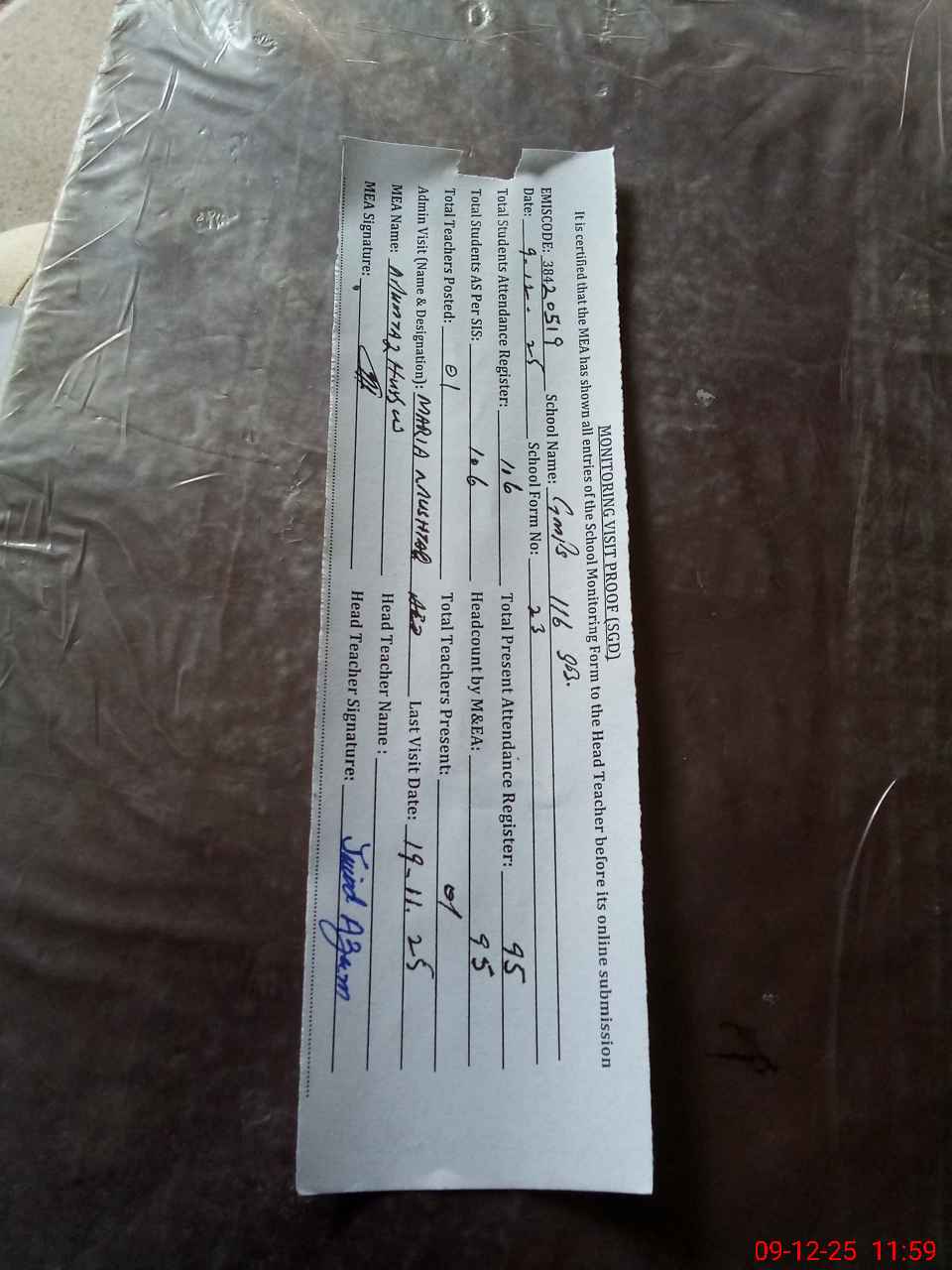 | Attendance Register | Head Teacher | MEA with School | Visit Proof |