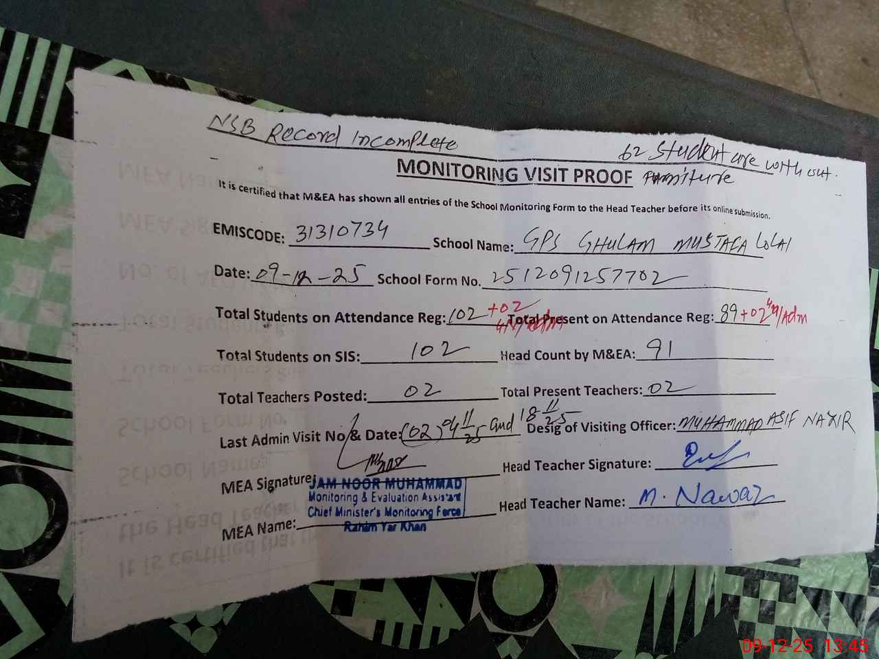 | EMIS Code: 31310734 | Name of School: GPS GHULAM MUSTAFA LOLAI | |||