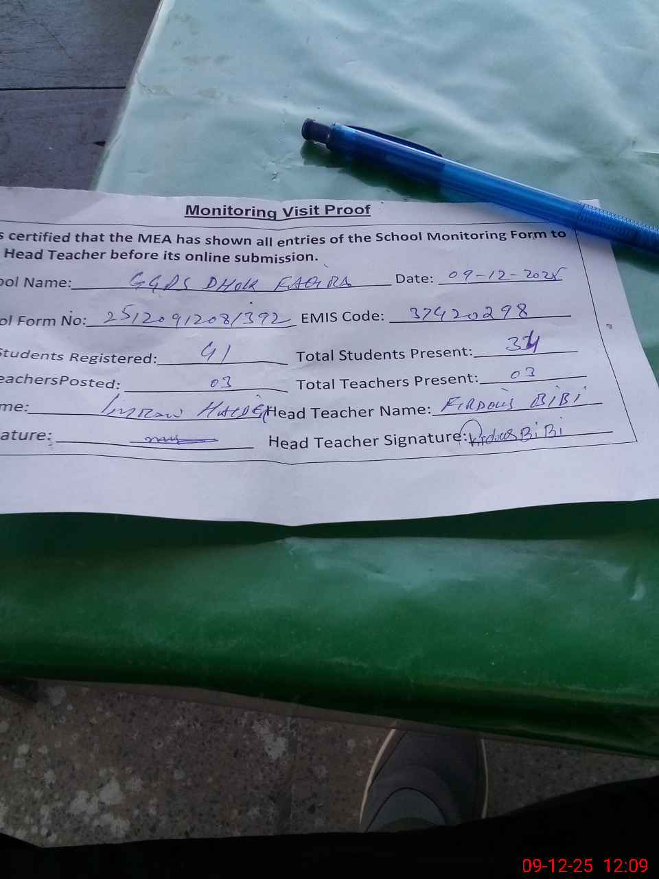 | Attendance Register | Head Teacher | MEA with School | Visit Proof |