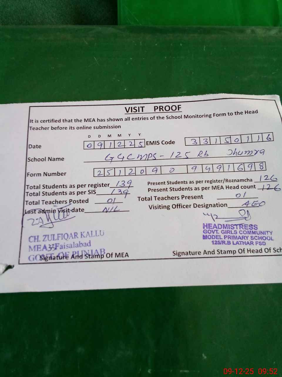 | Attendance Register | Head Teacher | MEA with School | Visit Proof |