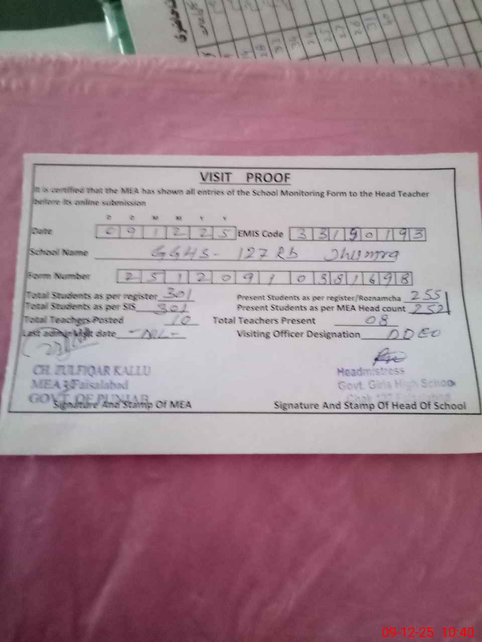 | Certified that this School was Inspected by the Undersigned MEA/DMO Today and the Information Stated Above is as Per Record. | |||||
