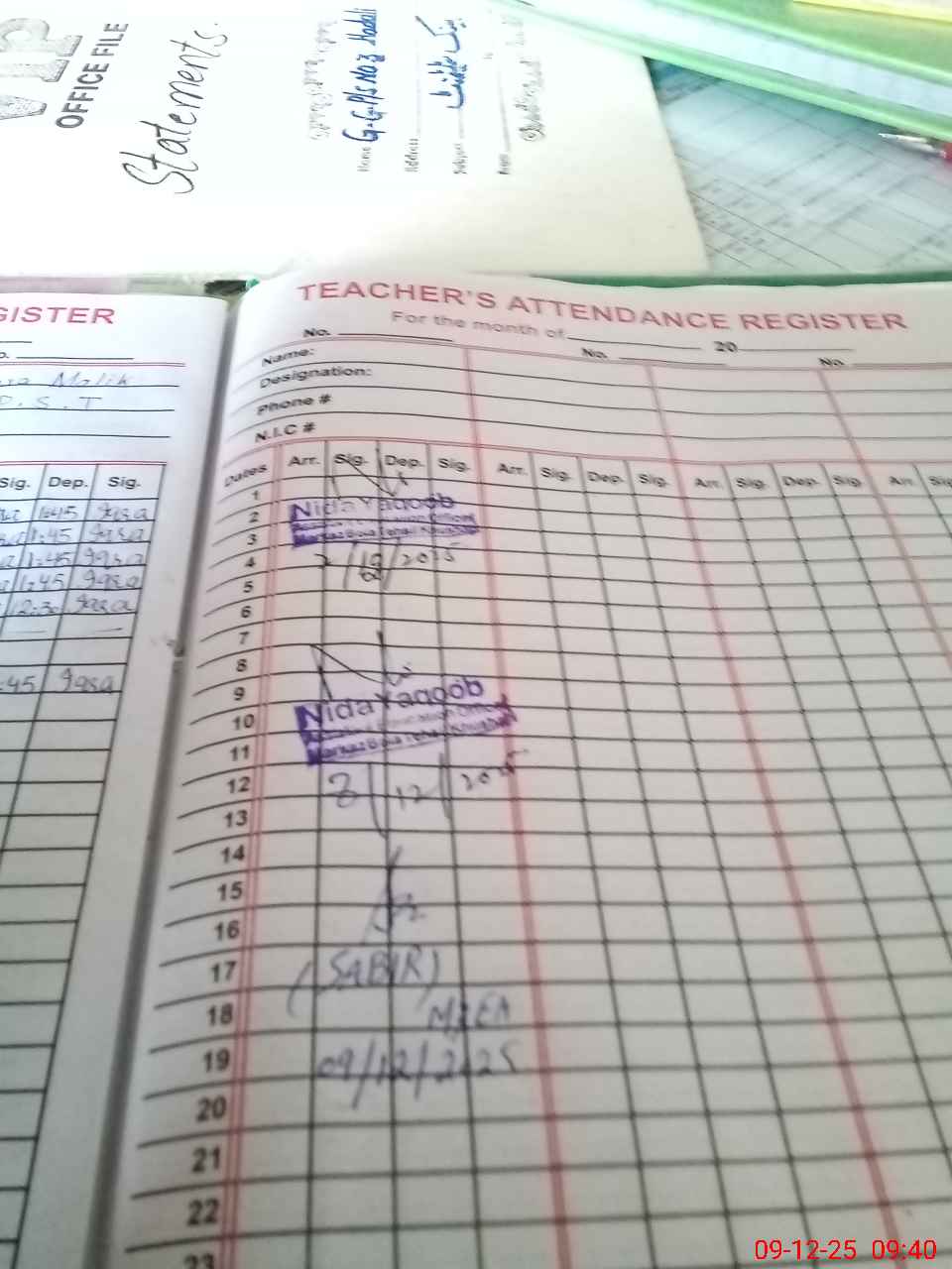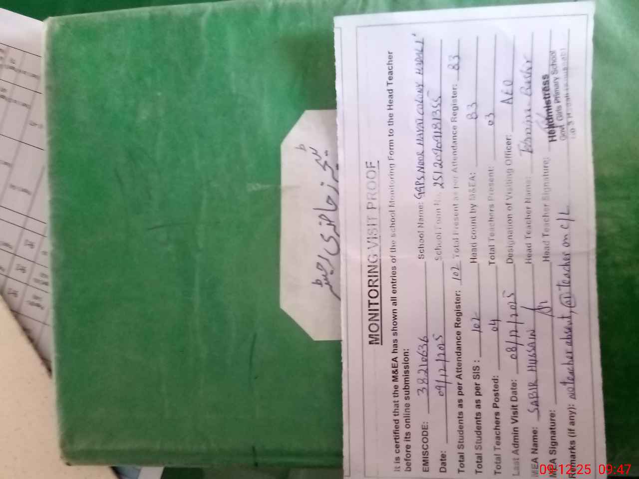 | Remarks (Use Separate Page if Required): no teacher absent total students on register 102 total students on SiS 102 last admin visit by AEO on 08 Dec 2025 present students 83 | |||||
