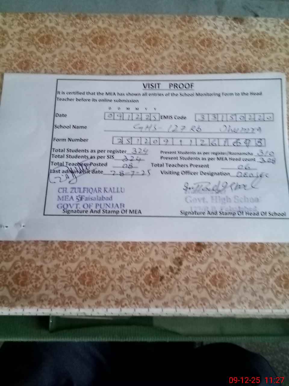 | Attendance Register | Head Teacher | MEA with School | Visit Proof |