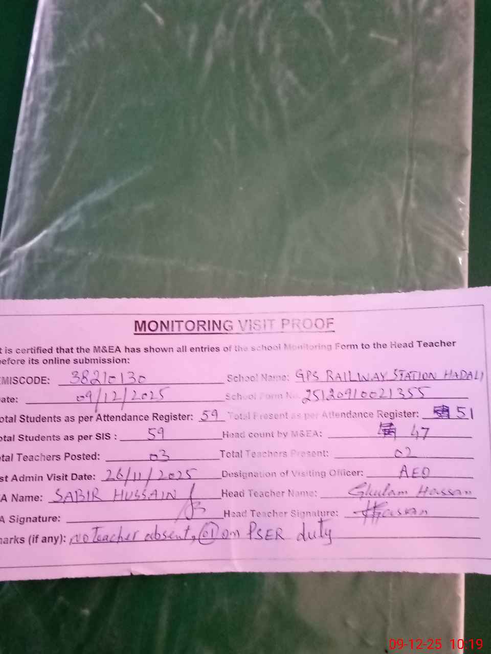 | Remarks (Use Separate Page if Required): no teacher absent total students on register 59 total students on SiS 59 by the head statement where as school Tab is not available present students 47 last admin visit by AEO on 26 Nov 2025 | |||||