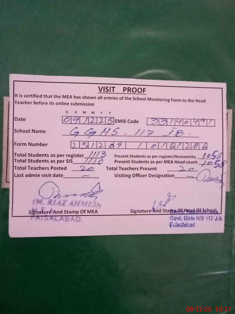 | EMIS Code: 33140491 | Name of School: GGHS CHAK 117 JB | |||
