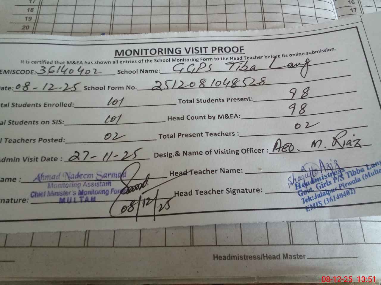 | Attendance Register | Head Teacher | MEA with School | Visit Proof |