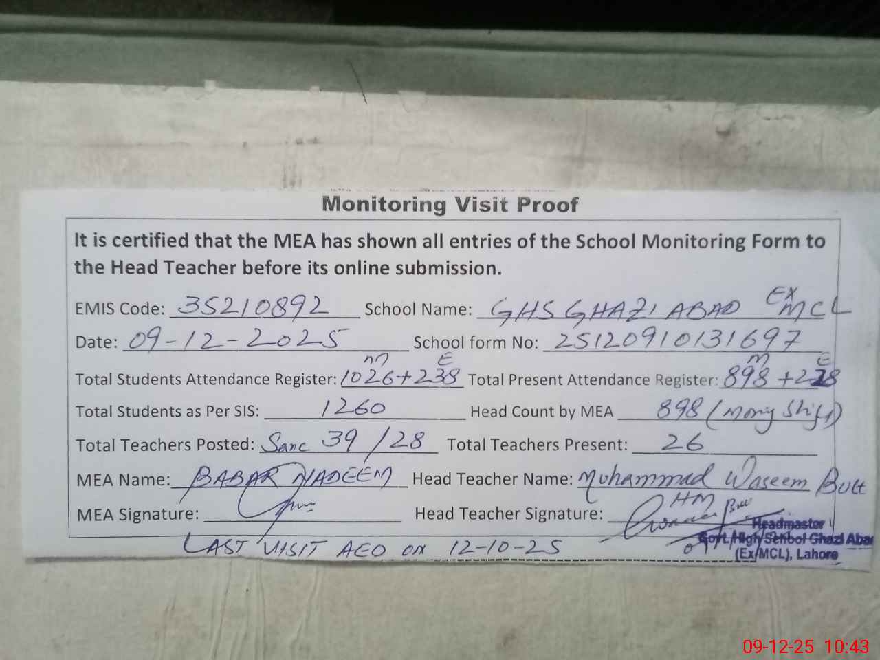 | Certified that this School was Inspected by the Undersigned MEA/DMO Today and the Information Stated Above is as Per Record. | |||||