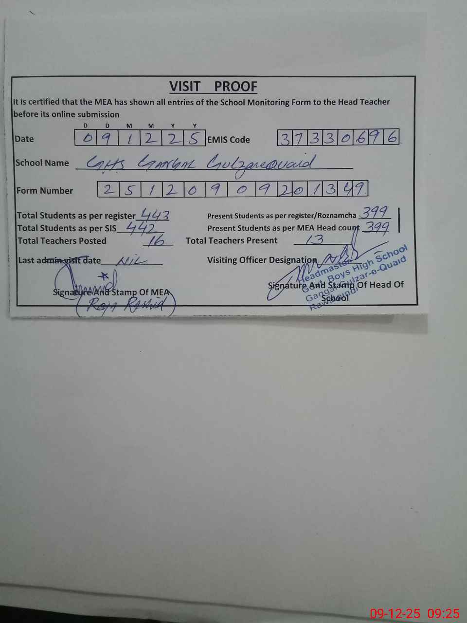 | Attendance Register | Head Teacher | MEA with School | Visit Proof |