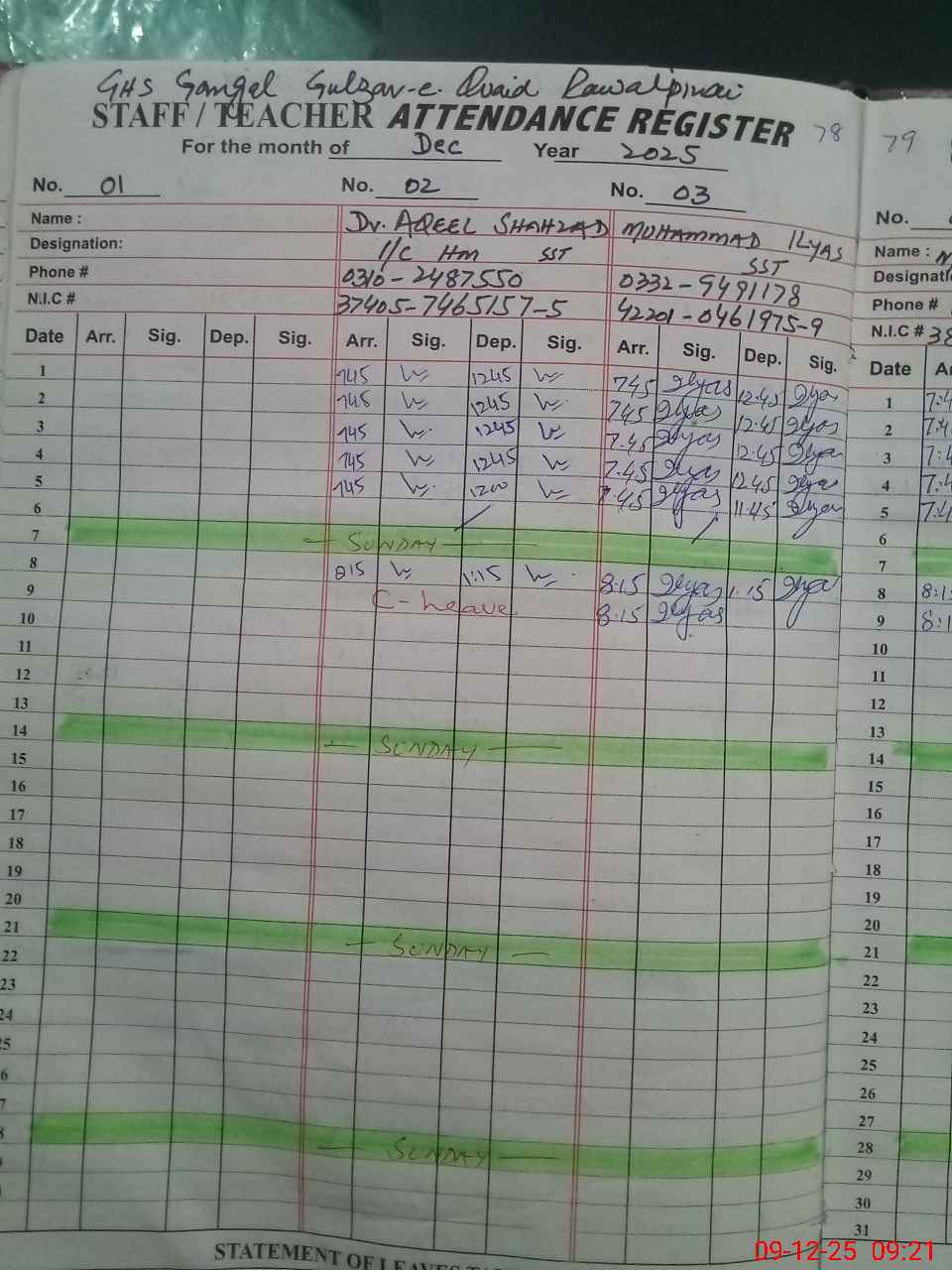 | CNIC | Full Name | Designation | R/C | Absence during last cal. month |