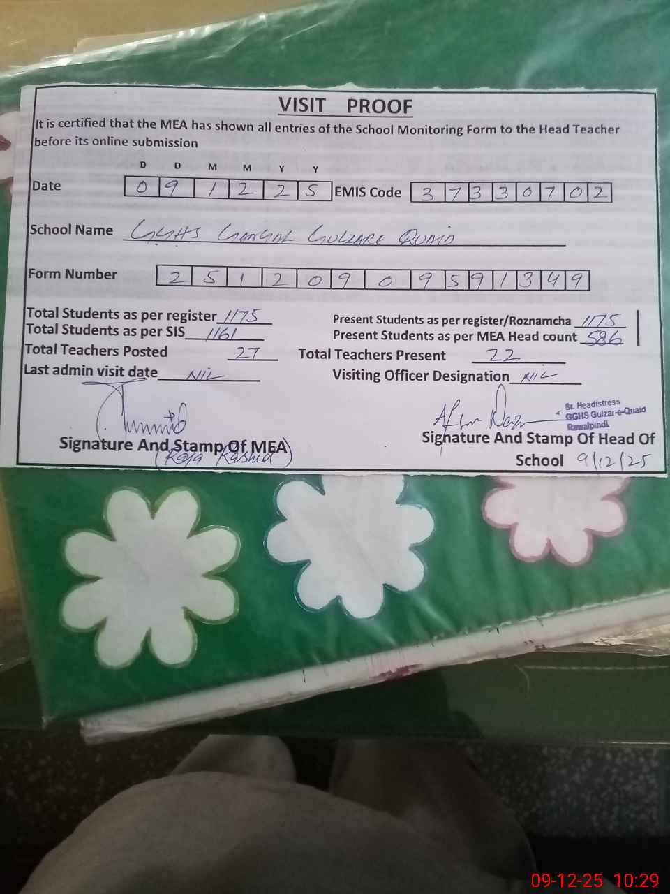 | Attendance Register | Head Teacher | MEA with School | Visit Proof |