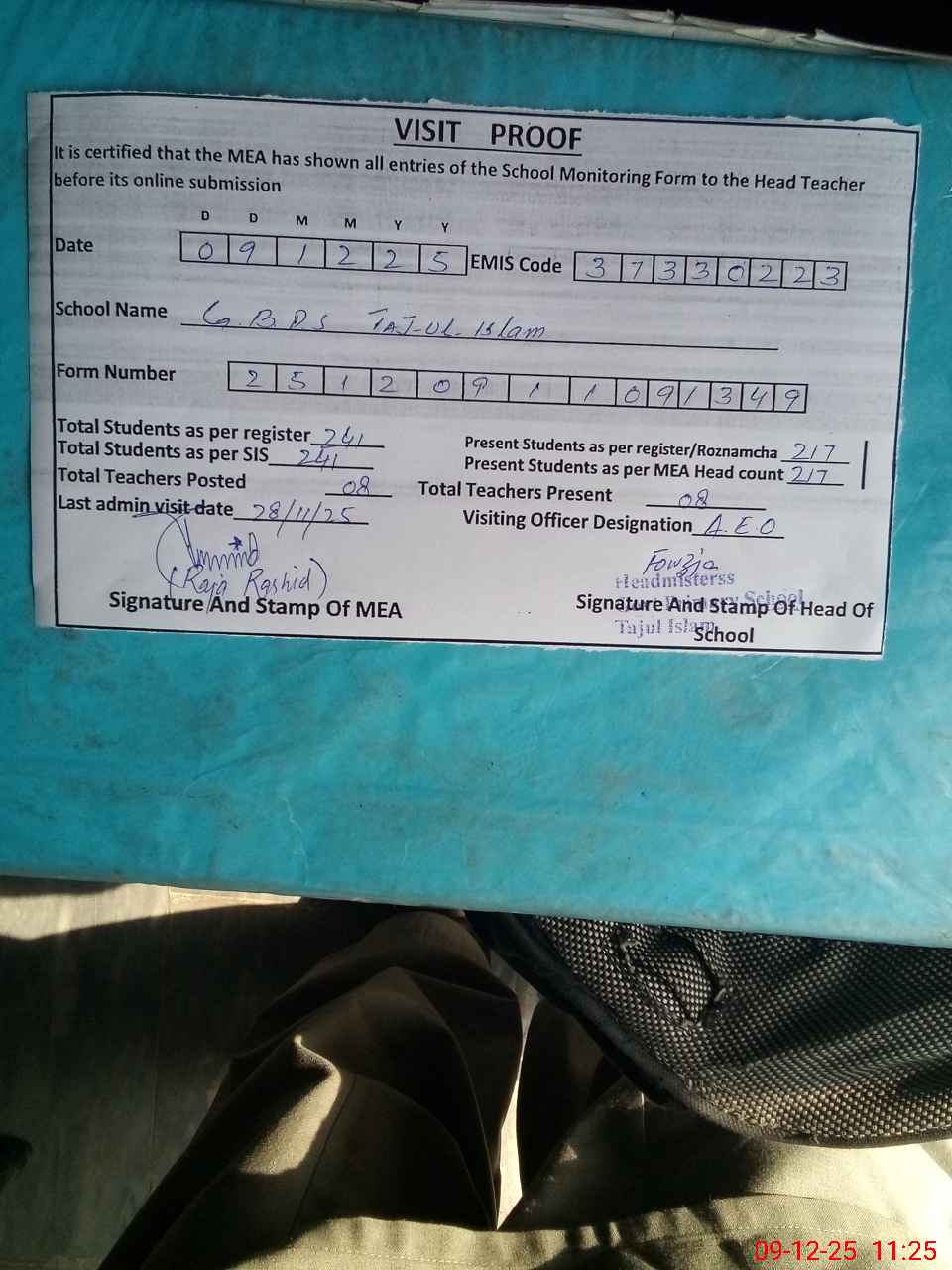 | EMIS Code: 37330223 | Name of School: GPS TAJ UL ISLAM | |||